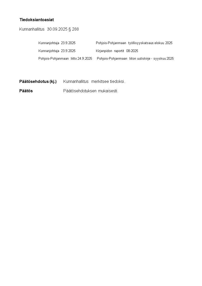 Pöytäkirja 30.09.2025/Pykälä 288