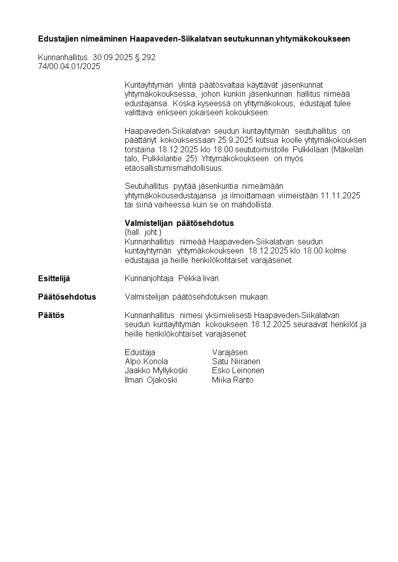 Pöytäkirja 30.09.2025/Pykälä 292