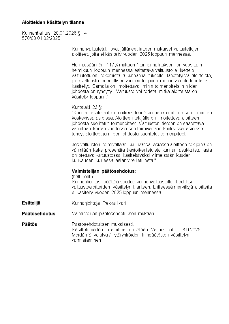 Pöytäkirja 20.01.2026/Pykälä 14