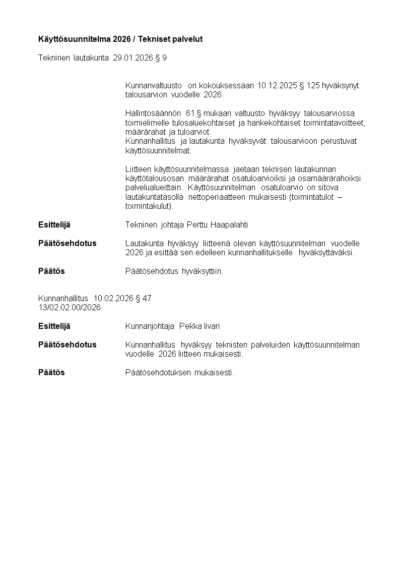 4 Käyttösuunnitelma 2026, Tekninen lautakunta