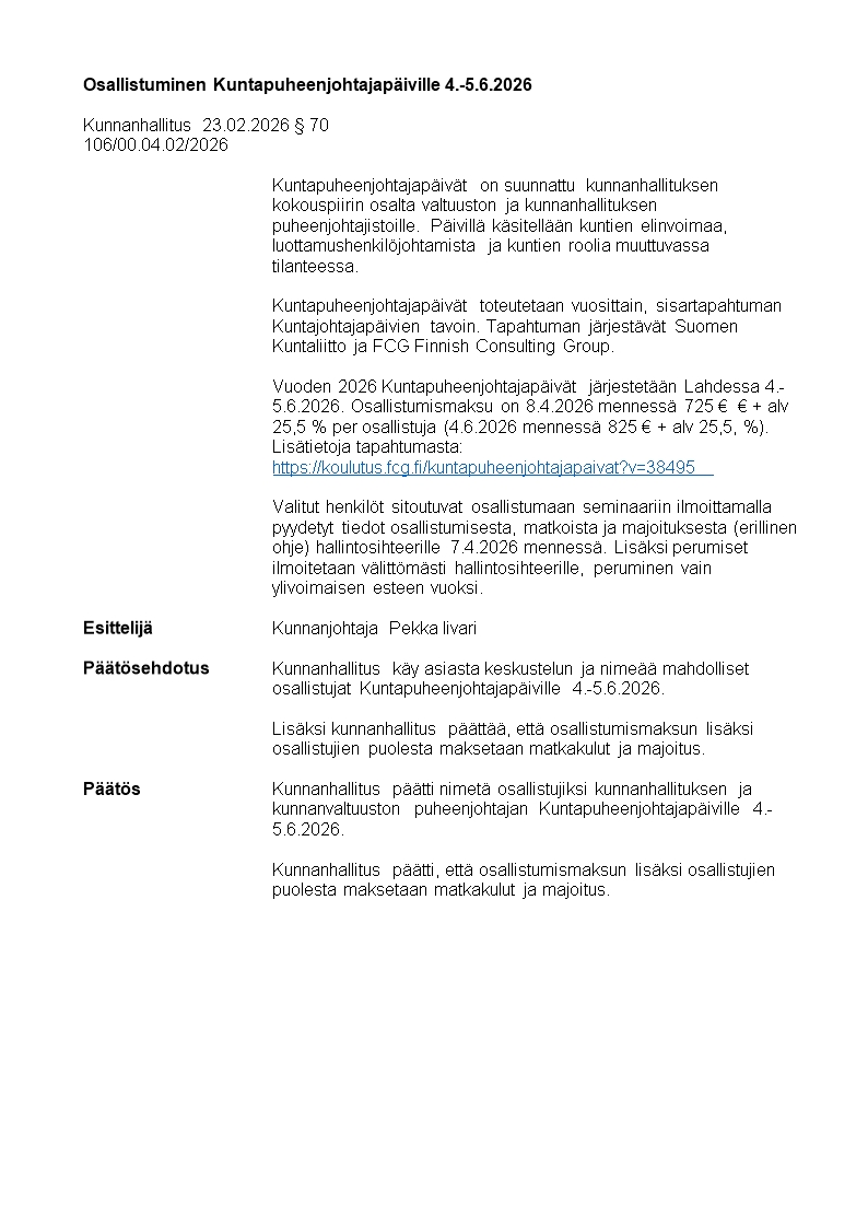 Pöytäkirja 23.02.2026/Pykälä 70